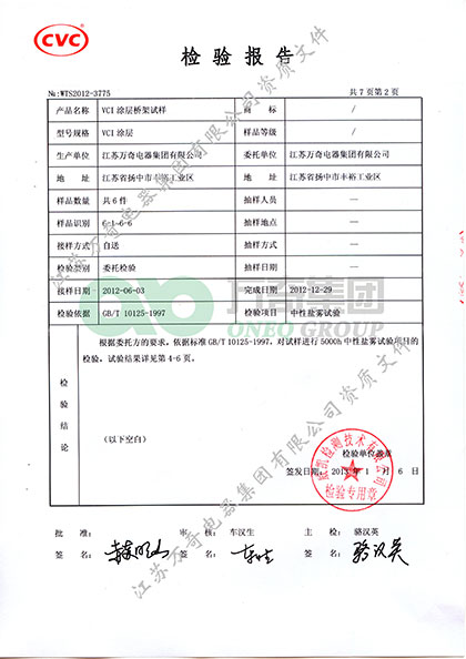节能桥架选用不锈钢材质,使产品在耐腐蚀性能、使用寿命和性价比方面都是无以伦比的。高耐腐VCI双金属无机涂层技术应用在桥架表面处理上,使桥架的抗腐性能大幅度提高,达到高长效抗腐作用,经检测机构广州威凯检测技术有限公司5000h盐雾试验,无腐蚀现象。弥补了热浸镀锌无机涂层抗腐蚀性能不足的缺陷,大大延长了桥架的使用寿命,经对比检验数据表明,该涂层的抗腐性能是热浸镀锌的50倍以上。新国标GB/T 23639-2017《节能耐腐蚀钢制电缆桥架》再次提高了高耐腐VCI双金属无机涂层的抗腐蚀性能指标,同时也提高了喷塑喷漆等有机涂层的酸碱性浸泡试验的标准要求。